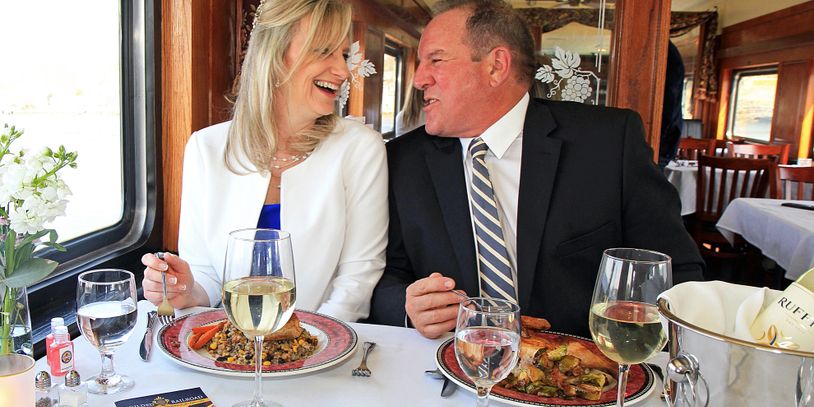 Reservations are required. When Booking your reservation, select the train you would like to experience, then choose your menu sections. The Train ticket does not include the price of the meal. Meals are chosen separately, and range in price like a traditional restaurant, along with other food options, like appetizers (additional charge) and deserts,. At checkout, the total ticket price will be calculated before any purchase is necessary. Once the experience, meal, and any additional options are chosen, the complete train ticket is ready for purchase. Your final ticket price includes the train ride and full-course meal, meal gratuity, and taxes. Tickets are nonrefundable and non-reschedulable within seven days from departure. Soft drinks and alcoholic beverages are additional and can be purchased onboard the train. Cash and all major CC’s accepted onboard our trains. See our menu page for complete meal descriptions.